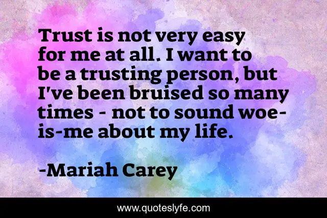This page presents the quote "Trust is not very easy for me at all. I want to be a trusting person, but I've been bruised so many times - not to sound woe-is-me about my life.". Author of this quote is Mariah Carey. This quote is about me, life, easy,.
