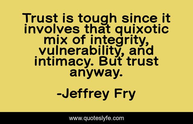 This page presents the quote "Trust is tough since it involves that quixotic mix of integrity, vulnerability, and intimacy. But trust anyway.". Author of this quote is Jeffrey Fry. This quote is about since, tough, vulnerability, intimancy, anyway, mix, quixotic, trust, integrity,.