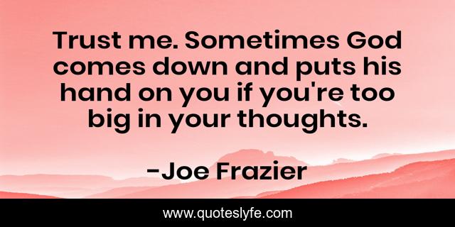 This page presents the quote "Trust me. Sometimes God comes down and puts his hand on you if you're too big in your thoughts.". Author of this quote is Joe Frazier. This quote is about me, god, thoughts,.