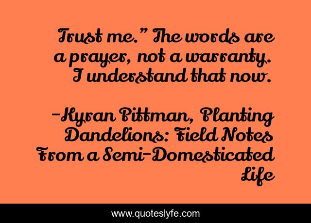 This page presents the quote "Trust me." The words are a prayer, not a warranty. I understand that now.". Author of this quote is Kyran Pittman, Planting Dandelions: Field Notes From a Semi-Domesticated Life. This quote is about parenting, trust, disappointment,.