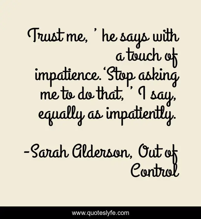 This page presents the quote "Trust me, ’ he says with a touch of impatience.‘Stop asking me to do that, ’ I say, equally as impatiently.". Author of this quote is Sarah Alderson, Out of Control. This quote is about romance, humor, young-adult, thriller,.