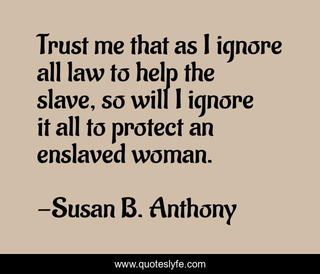 This page presents the quote "Trust me that as I ignore all law to help the slave, so will I ignore it all to protect an enslaved woman.". Author of this quote is Susan B. Anthony. This quote is about trust, woman, law,.