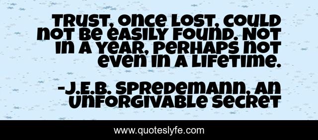 This page presents the quote "Trust, once lost, could not be easily found. Not in a year, perhaps not even in a lifetime.". Author of this quote is J.E.B. Spredemann, An Unforgivable Secret. This quote is about betrayal, trust, disloyalty, loyalty,.