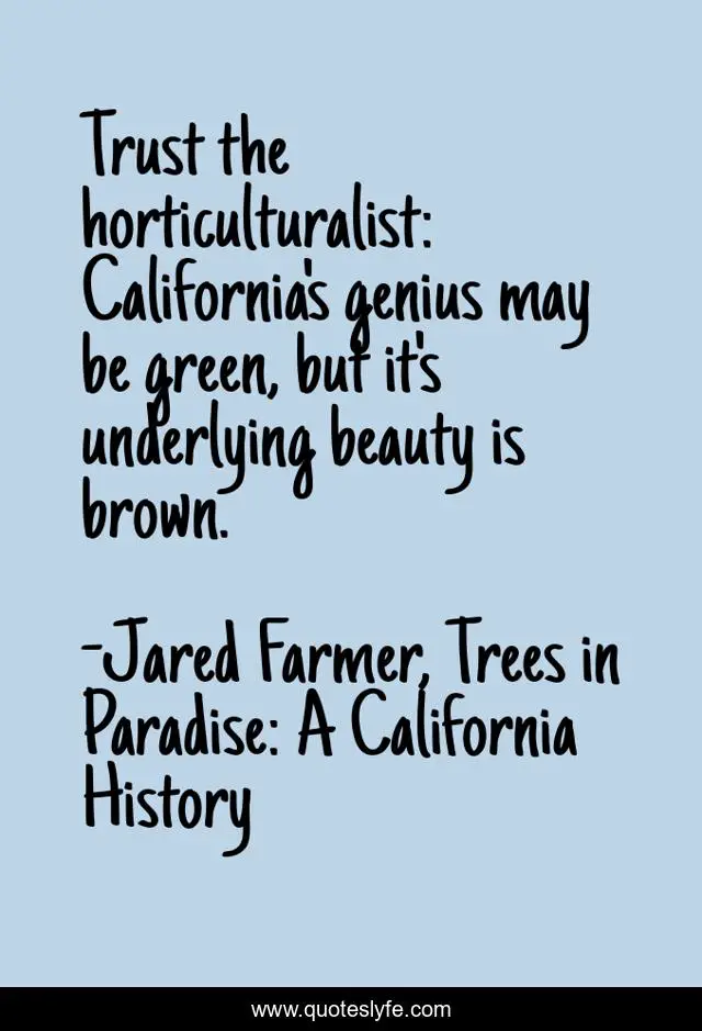 This page presents the quote "Trust the horticulturalist: California's genius may be green, but it's underlying beauty is brown.". Author of this quote is Jared Farmer, Trees in Paradise: A California History. This quote is about environment, afforestation, california, trees,.