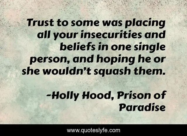 This page presents the quote "Trust to some was placing all your insecurities and beliefs in one single person, and hoping he or she wouldn’t squash them.". Author of this quote is Holly Hood, Prison of Paradise. This quote is about life, trust, love, hope, affection,.