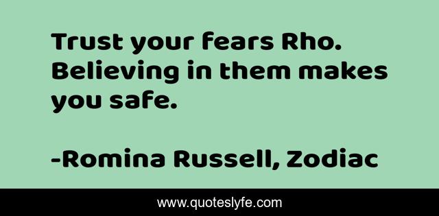 This page presents the quote "Trust your fears Rho. Believing in them makes you safe.". Author of this quote is Romina Russell, Zodiac. This quote is about saftey, trust, fear, belief,.
