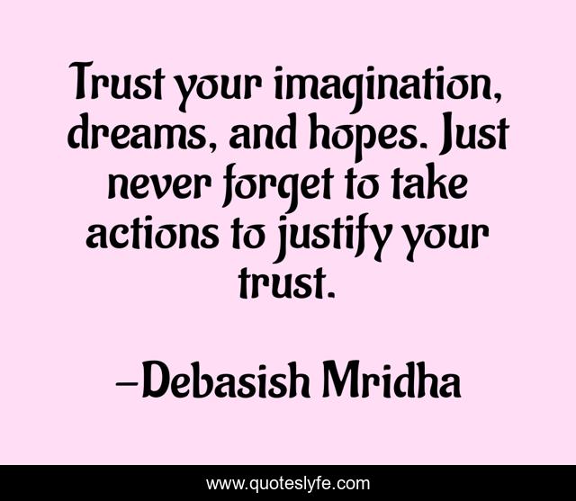 This page presents the quote "Trust your imagination, dreams, and hopes. Just never forget to take actions to justify your trust.". Author of this quote is Debasish Mridha. This quote is about quotes, philosophy, debasish-mridha, justify-your-trust, imagination, debasish-mridha-md, inspirational, enthusiasm, dreams,.