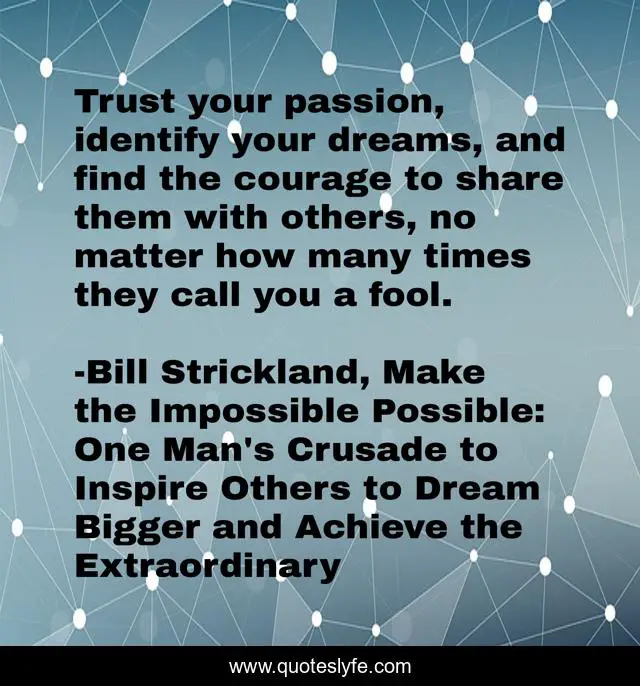 This page presents the quote "Trust your passion, identify your dreams, and find the courage to share them with others, no matter how many times they call you a fool.". Author of this quote is Bill Strickland, Make the Impossible Possible: One Man's Crusade to Inspire Others to Dream Bigger and Achieve the Extraordinary. This quote is about confidence, positive, motivational, optimistic, inspirational, enthusiasm,.