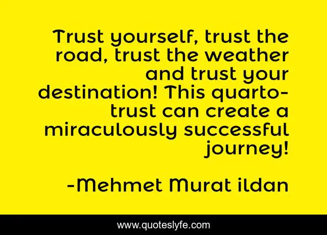 This page presents the quote "Trust yourself, trust the road, trust the weather and trust your destination! This quarto-trust can create a miraculously successful journey!". Author of this quote is Mehmet Murat ildan. This quote is about murat-ildan, destination, journey, succesful, path, trust, road,.