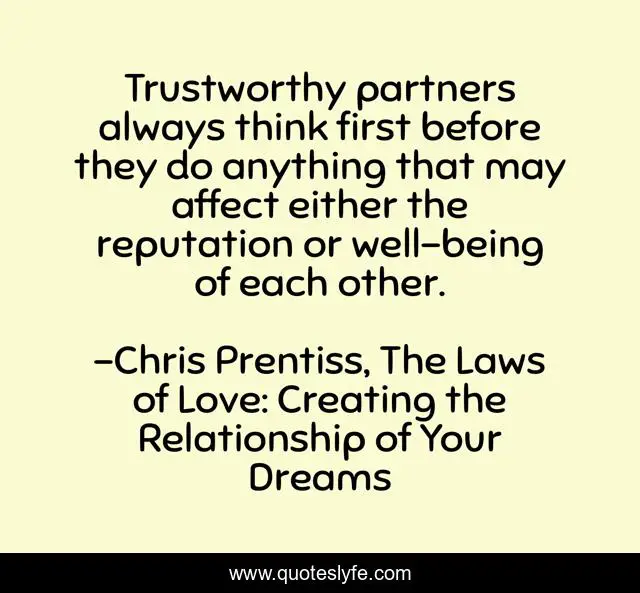 "Chris Prentiss, The Laws of Love: Creating the Relationship of Your Dreams Quotes." Quoteslyfe.com, 2025. Fri. 05 Dec. 2025. <https://www.quoteslyfe.com/quote/Trustworthy-partners-always-think-first-before-they-106274>.