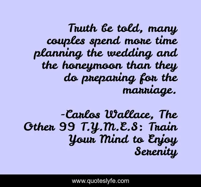 This page presents the quote "Truth be told, many couples spend more time planning the wedding and the honeymoon than they do preparing for the marriage.". Author of this quote is Carlos Wallace, The Other 99 T.Y.M.E.S: Train Your Mind to Enjoy Serenity. This quote is about relationships, relationship-advice, marraige-issues, relationship, engagement-ring,.