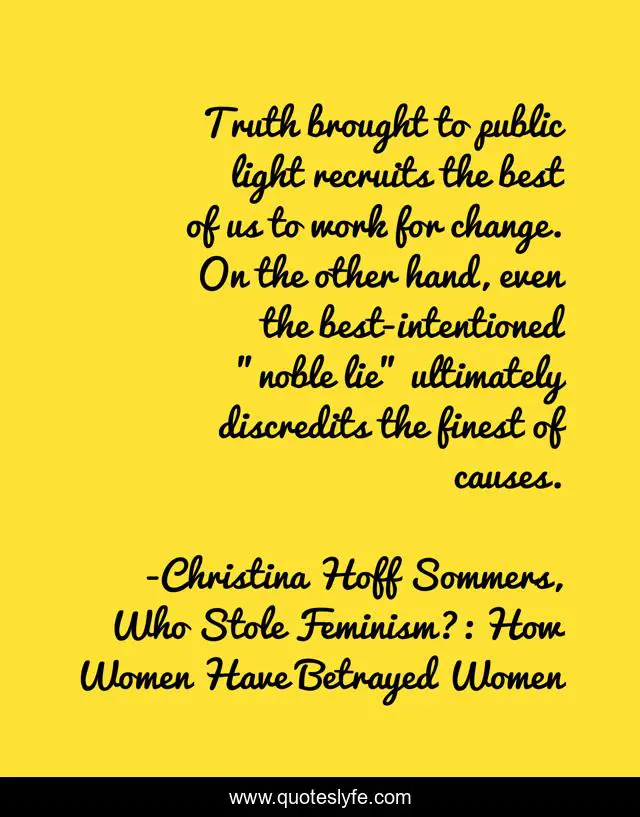 This page presents the quote "Truth brought to public light recruits the best of us to work for change. On the other hand, even the best-intentioned "noble lie" ultimately discredits the finest of causes.". Author of this quote is Christina Hoff Sommers, Who Stole Feminism?: How Women Have Betrayed Women. .