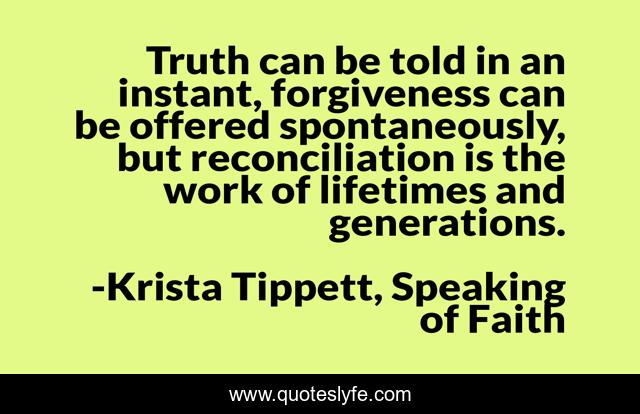 This page presents the quote "Truth can be told in an instant, forgiveness can be offered spontaneously, but reconciliation is the work of lifetimes and generations.". Author of this quote is Krista Tippett, Speaking of Faith. This quote is about reconciliation, forgiveness, truth,.