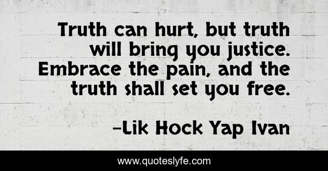 This page presents the quote "Truth can hurt, but truth will bring you justice. Embrace the pain, and the truth shall set you free.". Author of this quote is Lik Hock Yap Ivan. This quote is about motivation, pain, justice, free, embrace, truth, wise, inspiration,.