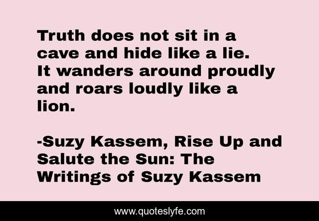This page presents the quote "Truth does not sit in a cave and hide like a lie. It wanders around proudly and roars loudly like a lion.". Author of this quote is Suzy Kassem, Rise Up and Salute the Sun: The Writings of Suzy Kassem. This quote is about lie, inspirational, quotes, lion, truth, enthusiasm, suzy-kassem,.