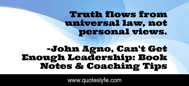 This page presents the quote "Truth flows from universal law, not personal views.". Author of this quote is John Agno, Can't Get Enough Leadership: Book Notes & Coaching Tips. This quote is about time-management, life-signature, boomer-life-tips, leadership-books, stress-management, women-and-time, boomer-retirement, leadership-tips,.