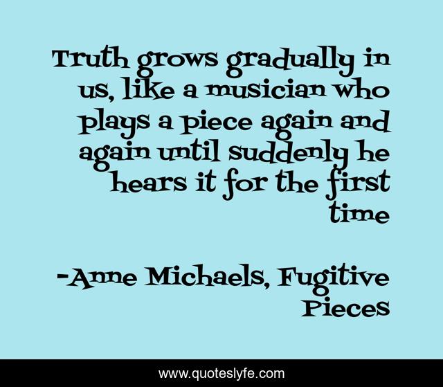 This page presents the quote "Truth grows gradually in us, like a musician who plays a piece again and again until suddenly he hears it for the first time". Author of this quote is Anne Michaels, Fugitive Pieces. This quote is about truth-of-life, truth-inspirational, truth,.