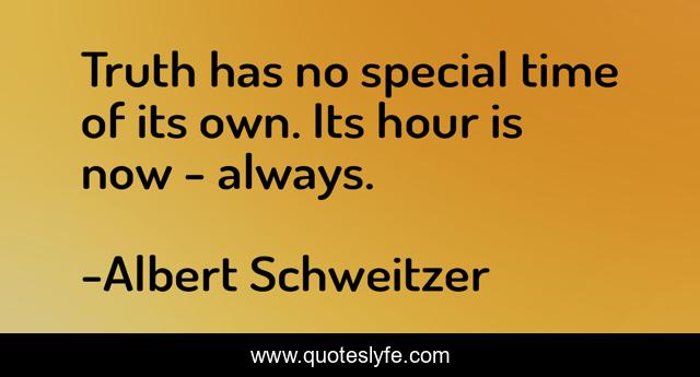 This page presents the quote "Truth has no special time of its own. Its hour is now - always.". Author of this quote is Albert Schweitzer. This quote is about truth, special, time,.