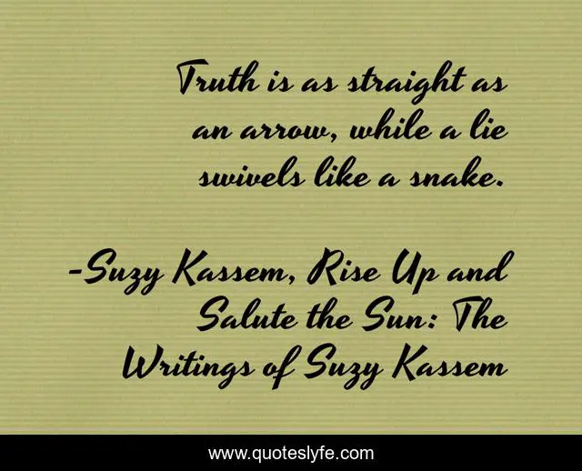This page presents the quote "Truth is as straight as an arrow, while a lie swivels like a snake.". Author of this quote is Suzy Kassem, Rise Up and Salute the Sun: The Writings of Suzy Kassem. This quote is about lie, liar, arrow, straightforward, media, lies, snake, truth, news,.