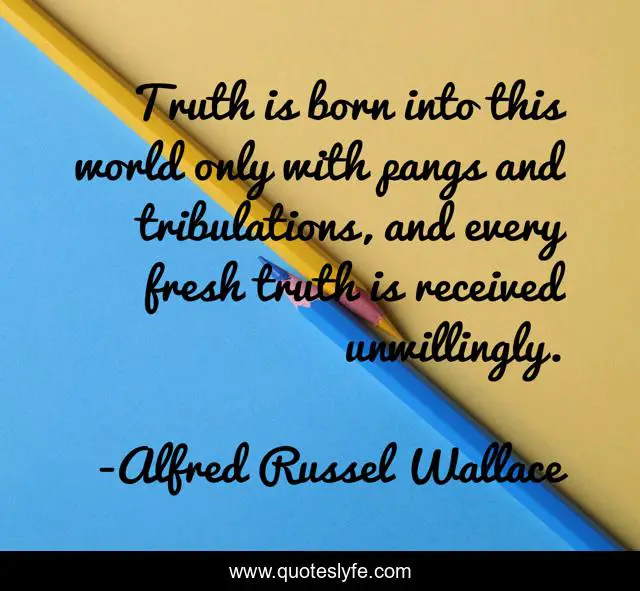This page presents the quote "Truth is born into this world only with pangs and tribulations, and every fresh truth is received unwillingly.". Author of this quote is Alfred Russel Wallace. This quote is about world, truth is, born,.