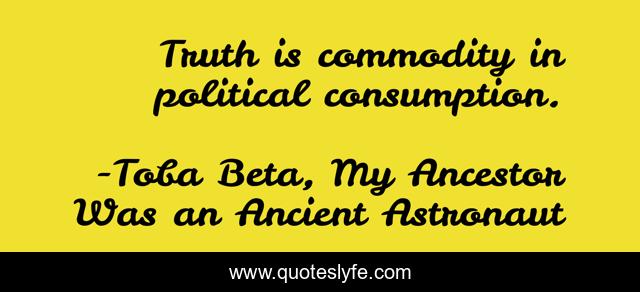 This page presents the quote "Truth is commodity in political consumption.". Author of this quote is Toba Beta, My Ancestor Was an Ancient Astronaut. This quote is about commodity, political, consumption, truth,.