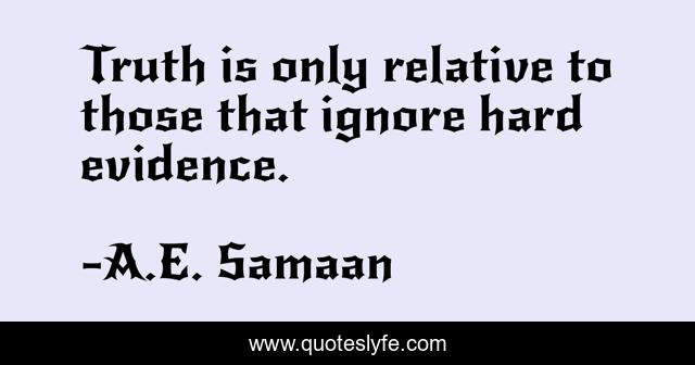 This page presents the quote "Truth is only relative to those that ignore hard evidence.". Author of this quote is A.E. Samaan. This quote is about moral-relativism, truth, relativism, evidence, history, comprehension, truth-telling, understanding, comprehending,.