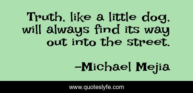 This page presents the quote "Truth, like a little dog, will always find its way out into the street.". Author of this quote is Michael Mejia. .