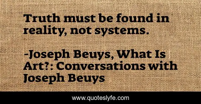 This page presents the quote "Truth must be found in reality, not systems.". Author of this quote is Joseph Beuys, What Is Art?: Conversations with Joseph Beuys. This quote is about truth, reality,.