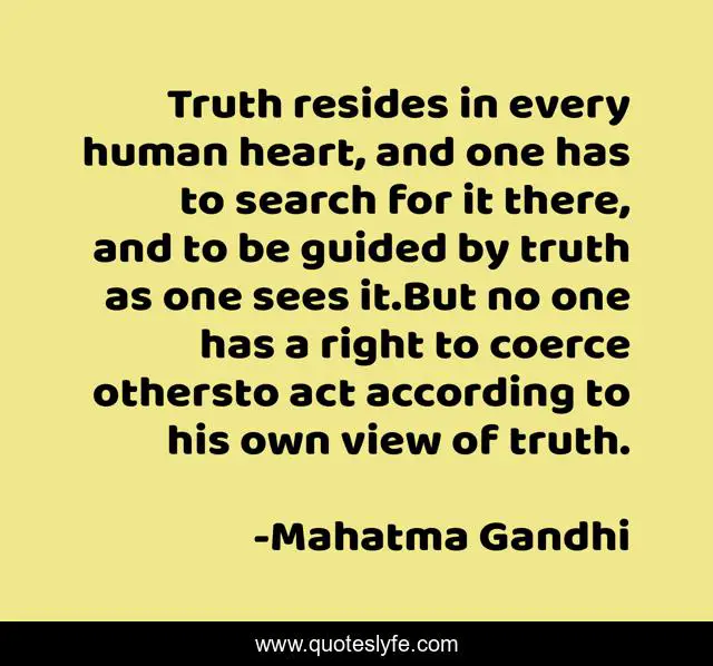 This page presents the quote "Truth resides in every human heart, and one has to search for it there, and to be guided by truth as one sees it.But no one has a right to coerce othersto act according to his own view of truth.". Author of this quote is Mahatma Gandhi. .