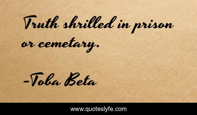 This page presents the quote "Truth shrilled in prison or cemetary.". Author of this quote is Toba Beta. This quote is about cemetary, truth, prison,.