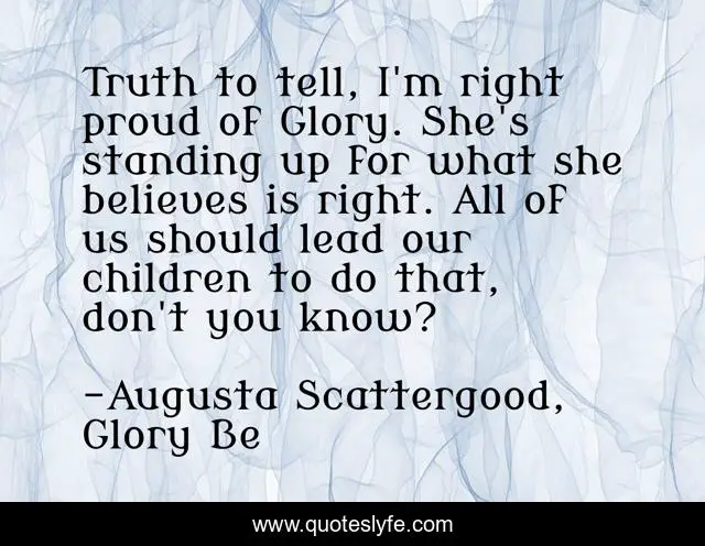 This page presents the quote "Truth to tell, I'm right proud of Glory. She's standing up for what she believes is right. All of us should lead our children to do that, don't you know?". Author of this quote is Augusta Scattergood, Glory Be. This quote is about believe, proud,.