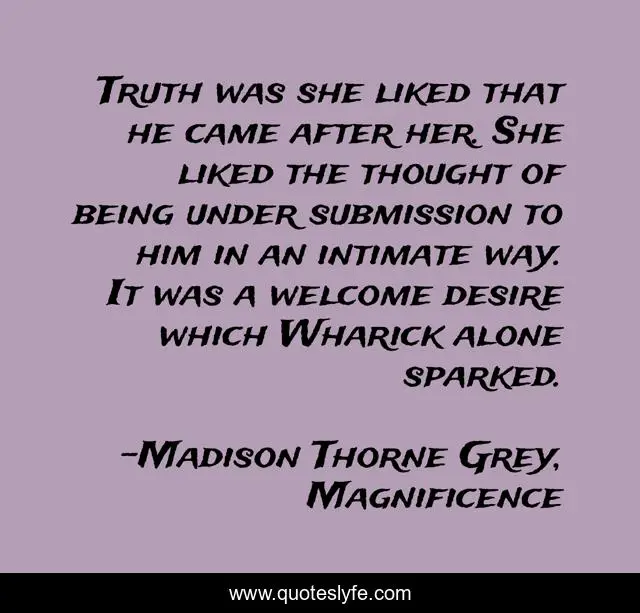 This page presents the quote "Truth was she liked that he came after her. She liked the thought of being under submission to him in an intimate way. It was a welcome desire which Wharick alone sparked.". Author of this quote is Madison Thorne Grey, Magnificence. This quote is about alpha-male, alpha-heroes, paranormal-romance, alpha-males, madison-thorne-grey,.