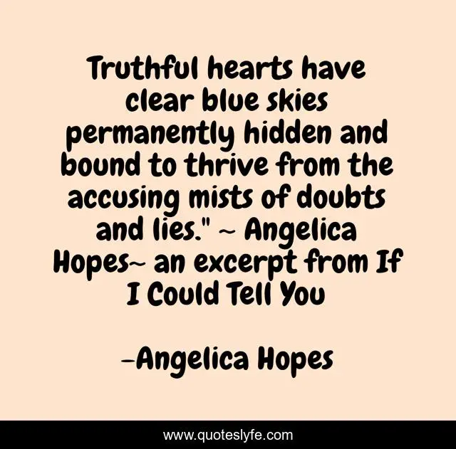 This page presents the quote "Truthful hearts have clear blue skies permanently hidden and bound to thrive from the accusing mists of doubts and lies." ~ Angelica Hopes~ an excerpt from If I Could Tell You". Author of this quote is Angelica Hopes. This quote is about lies, doubt, mistrust, truth,.