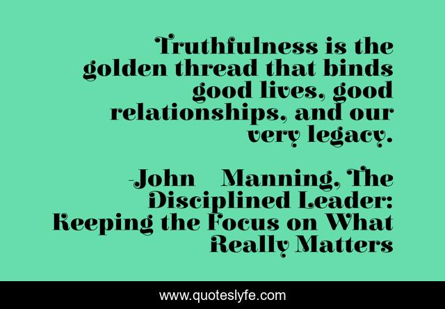 This page presents the quote "Truthfulness is the golden thread that binds good lives, good relationships, and our very legacy.". Author of this quote is John Manning, The Disciplined Leader: Keeping the Focus on What Really Matters. This quote is about relationships, truthfulness, legacy, lives, business,.