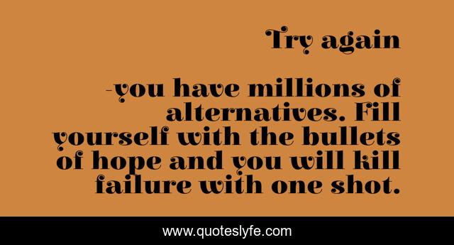 This page presents the quote "Try again". Author of this quote is you have millions of alternatives. Fill yourself with the bullets of hope and you will kill failure with one shot.. This quote is about israelmore ayivor, dream big!: see your bigger picture!,.