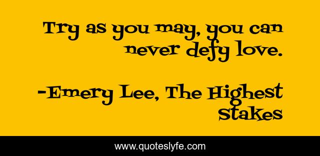 This page presents the quote "Try as you may, you can never defy love.". Author of this quote is Emery Lee, The Highest Stakes. This quote is about true-love, charlotte, love, destiny, robert, emery-lee, affection,.