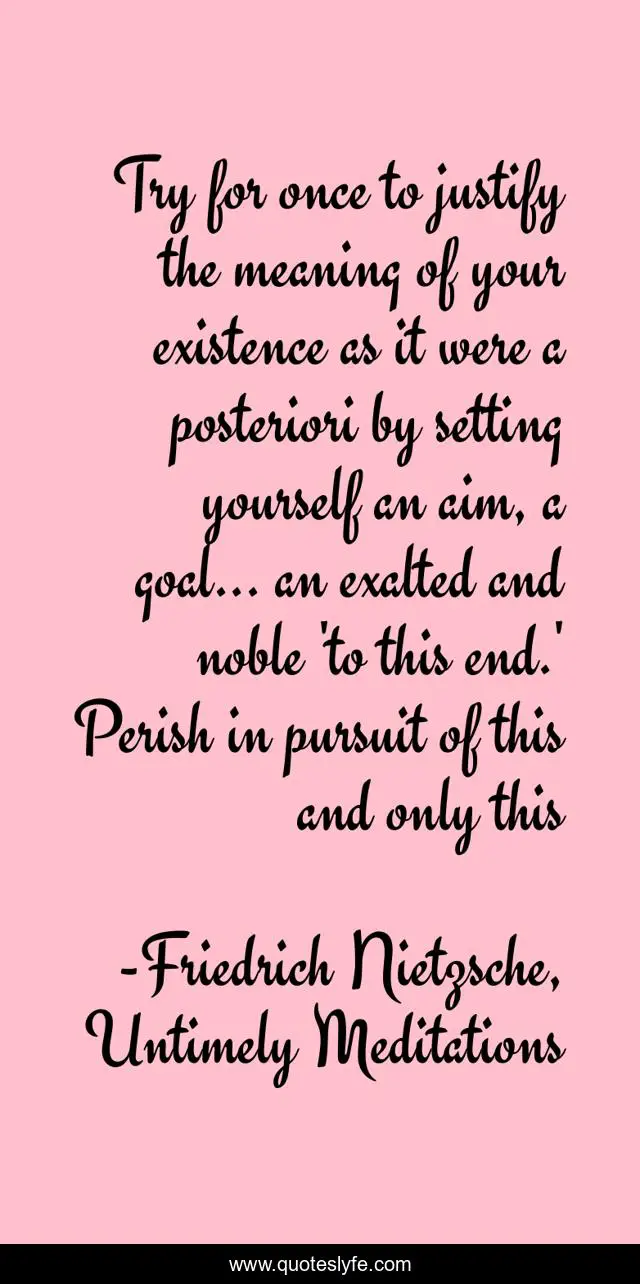 This page presents the quote "Try for once to justify the meaning of your existence as it were a posteriori by setting yourself an aim, a goal... an exalted and noble 'to this end.' Perish in pursuit of this and only this". Author of this quote is Friedrich Nietzsche, Untimely Meditations. This quote is about enthusiasm, philosophy, essential, inspirational,.