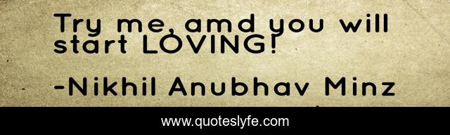 This page presents the quote "Try me, amd you will start LOVING!". Author of this quote is Nikhil Anubhav Minz. This quote is about romance, humor, love, relationship, affection,.