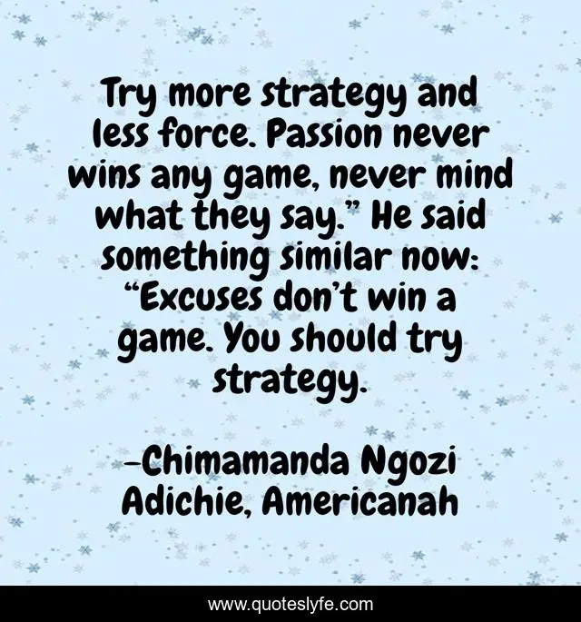 This page presents the quote "Try more strategy and less force. Passion never wins any game, never mind what they say.” He said something similar now: “Excuses don’t win a game. You should try strategy.". Author of this quote is Chimamanda Ngozi Adichie, Americanah. This quote is about win, game, strategy,.