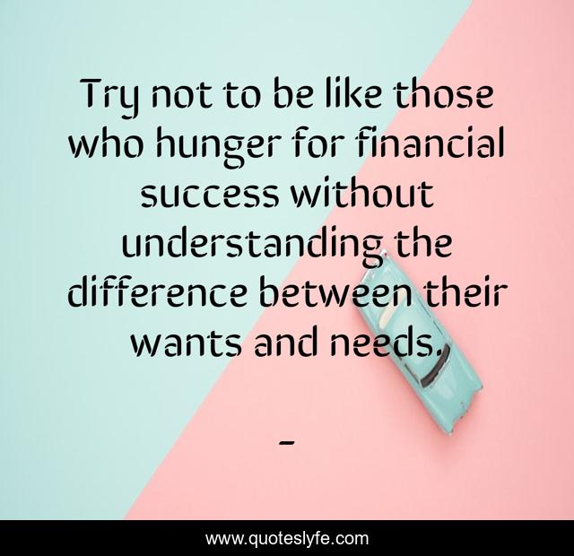 This page presents the quote "Try not to be like those who hunger for financial success without understanding the difference between their wants and needs.". Author of this quote is . This quote is about edmond-mbiaka, want-and-need, hungering-for-financial-success, financial-success, hunger-for-success,.
