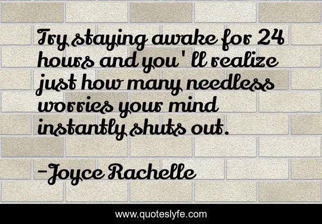 This page presents the quote "Try staying awake for 24 hours and you'll realize just how many needless worries your mind instantly shuts out.". Author of this quote is Joyce Rachelle. This quote is about declutter, stress, psychology, mindfulness, insomnia, sleeplessness, sleep, worries, worrying,.