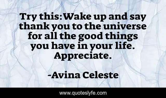 This page presents the quote "Try this:Wake up and say thank you to the universe for all the good things you have in your life. Appreciate.". Author of this quote is Avina Celeste. This quote is about confidence, positive, motivational, appreciate, optimistic, inspirational, enthusiasm,.