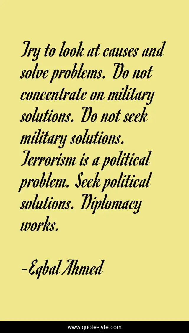 This page presents the quote "Try to look at causes and solve problems. Do not concentrate on military solutions. Do not seek military solutions. Terrorism is a political problem. Seek political solutions. Diplomacy works.". Author of this quote is Eqbal Ahmed. This quote is about politics, politics-of-the-united-states,.