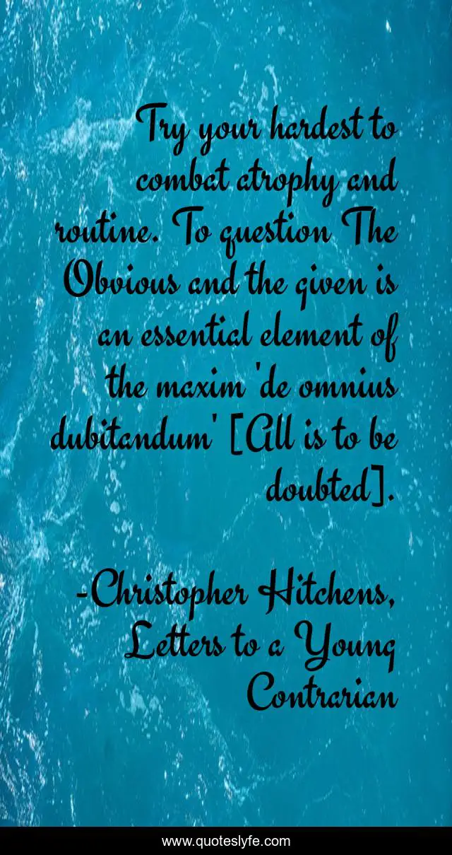 This page presents the quote "Try your hardest to combat atrophy and routine. To question The Obvious and the given is an essential element of the maxim 'de omnius dubitandum' [All is to be doubted].". Author of this quote is Christopher Hitchens, Letters to a Young Contrarian. This quote is about atrophy, doubt, routine, contrarian, wisdom,.