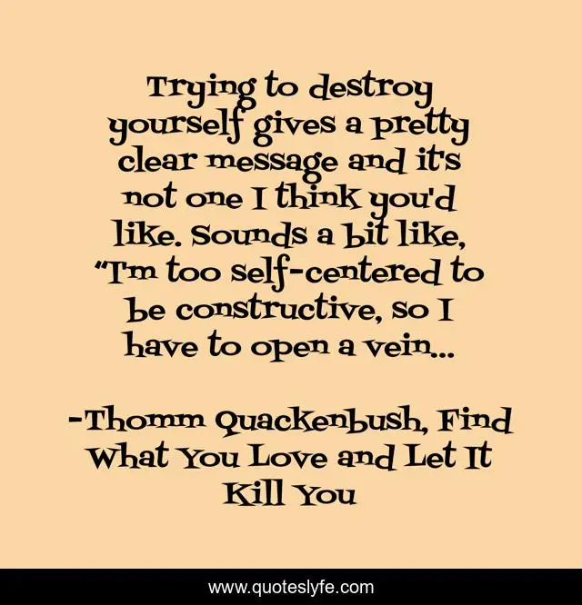 This page presents the quote "Trying to destroy yourself gives a pretty clear message and it's not one I think you'd like. Sounds a bit like, “I'm too self-centered to be constructive, so I have to open a vein…". Author of this quote is Thomm Quackenbush, Find What You Love and Let It Kill You. This quote is about self-injury, self-centered, suicide, self-harm,.