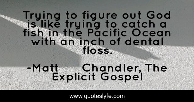 This page presents the quote "Trying to figure out God is like trying to catch a fish in the Pacific Ocean with an inch of dental floss.". Author of this quote is Matt Chandler, The Explicit Gospel. This quote is about sovereignty-of-god, theology,.