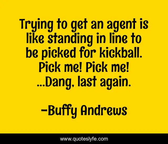 This page presents the quote "Trying to get an agent is like standing in line to be picked for kickball. Pick me! Pick me! ...Dang, last again.". Author of this quote is Buffy Andrews. This quote is about writers, writers-world, writers-life,.