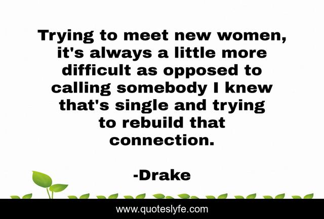 This page presents the quote "Trying to meet new women, it's always a little more difficult as opposed to calling somebody I knew that's single and trying to rebuild that connection.". Author of this quote is Drake. This quote is about single, trying, connection,.