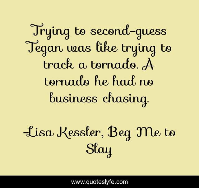 This page presents the quote "Trying to second-guess Tegan was like trying to track a tornado. A tornado he had no business chasing.". Author of this quote is Lisa Kessler, Beg Me to Slay. This quote is about demon-slayer, paranormal-romance,.