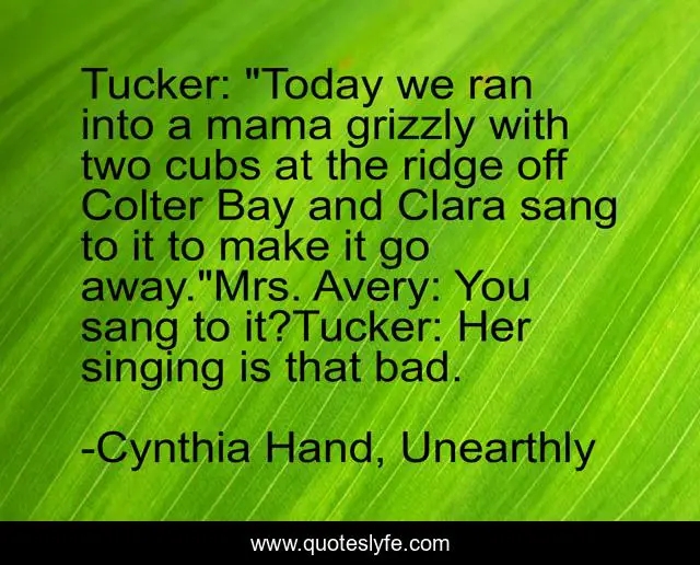 This page presents the quote "Tucker: "Today we ran into a mama grizzly with two cubs at the ridge off Colter Bay and Clara sang to it to make it go away."Mrs. Avery: You sang to it?Tucker: Her singing is that bad.". Author of this quote is Cynthia Hand, Unearthly. This quote is about singing, grizzly, tucker-avery, clara-gardner, humour,.